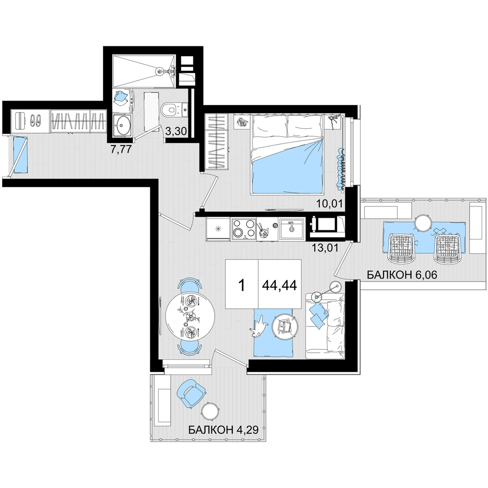 Общая площадь: 43.58м2