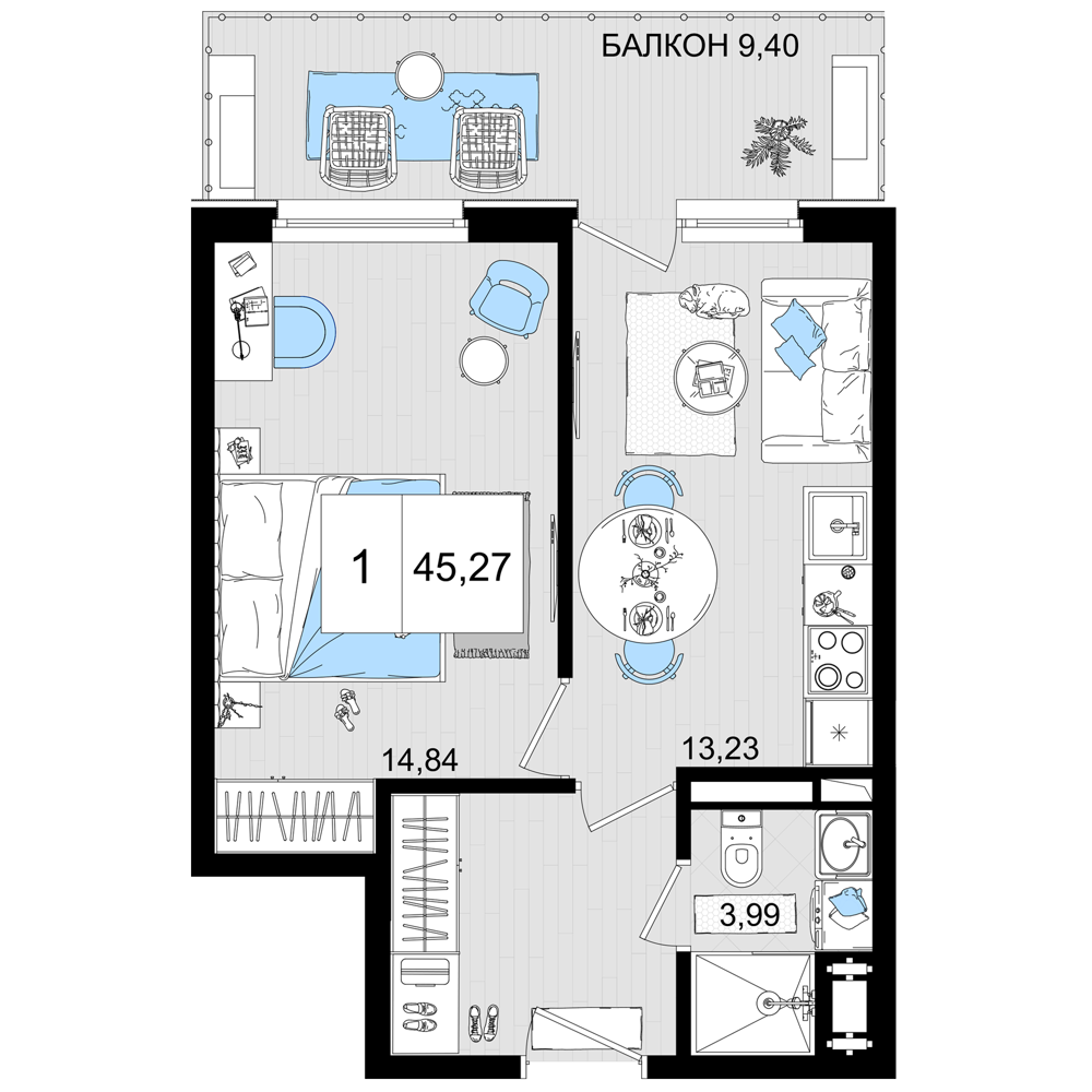 Общая площадь: 43.99м2