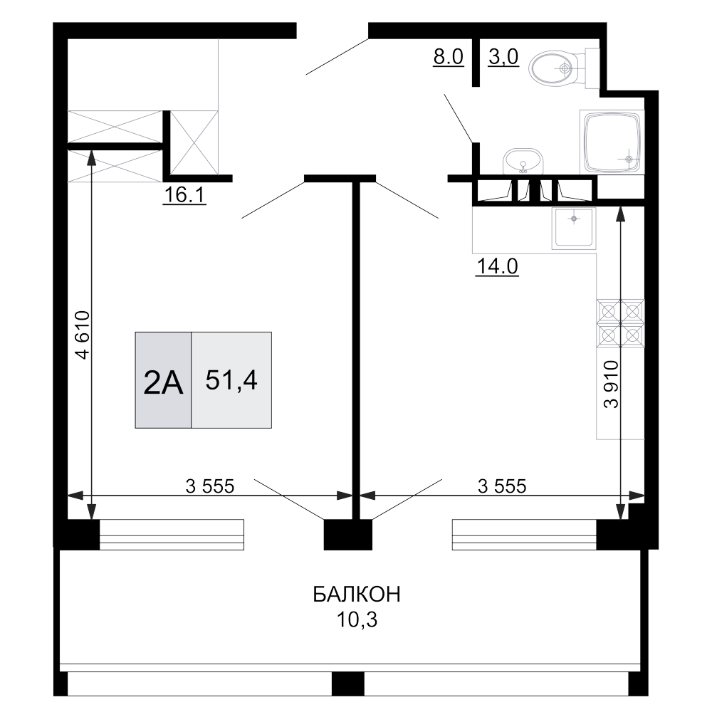 Общая площадь: 51.40м2