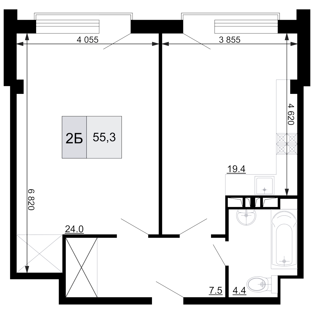 Общая площадь: 55.30м2