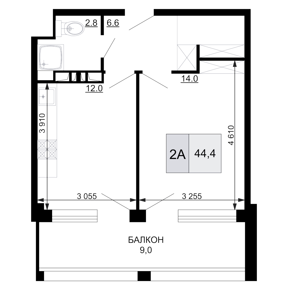 Квартира этаж 6, площадь 44.40 м2