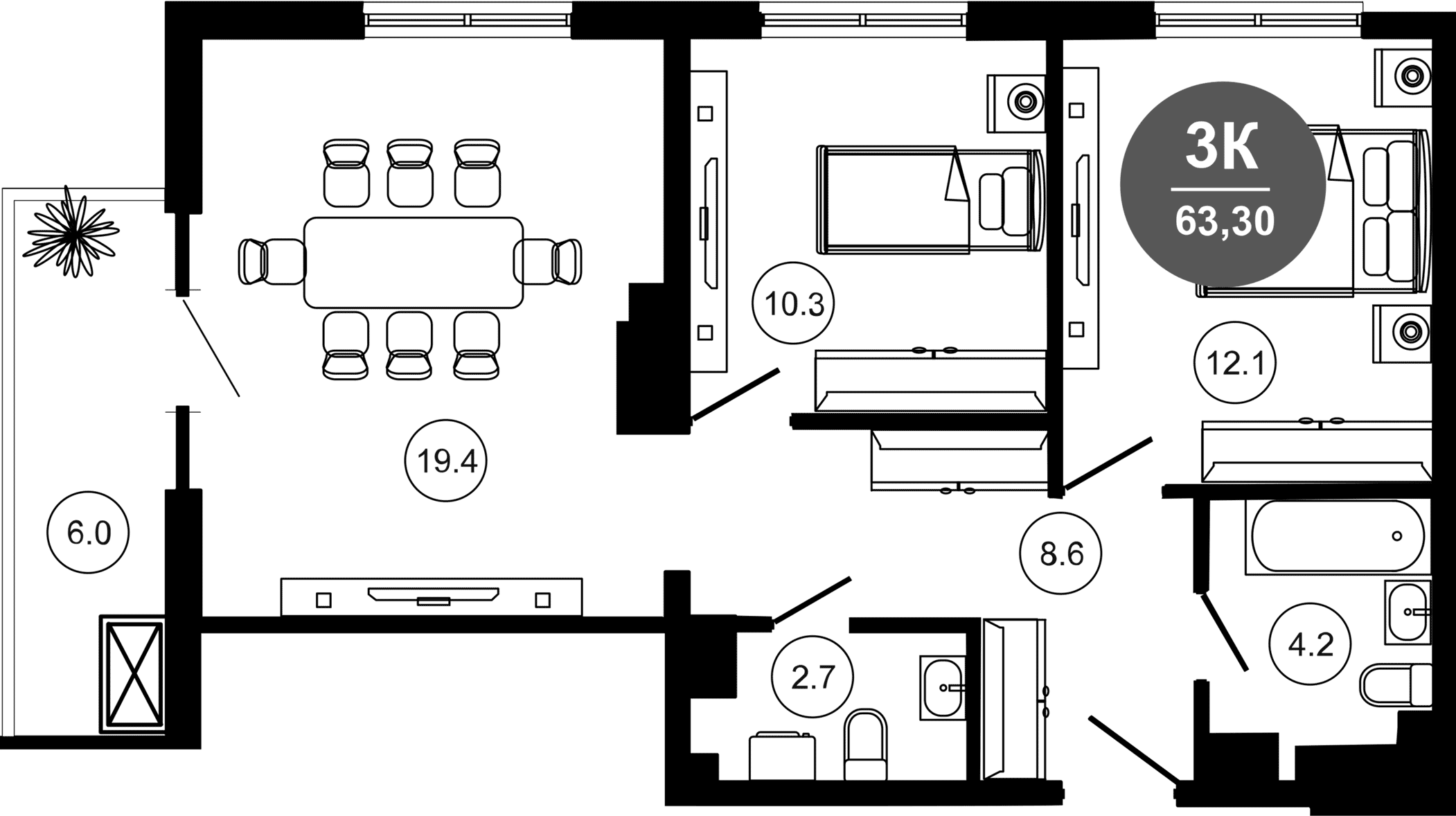 Общая площадь: 63.30м2