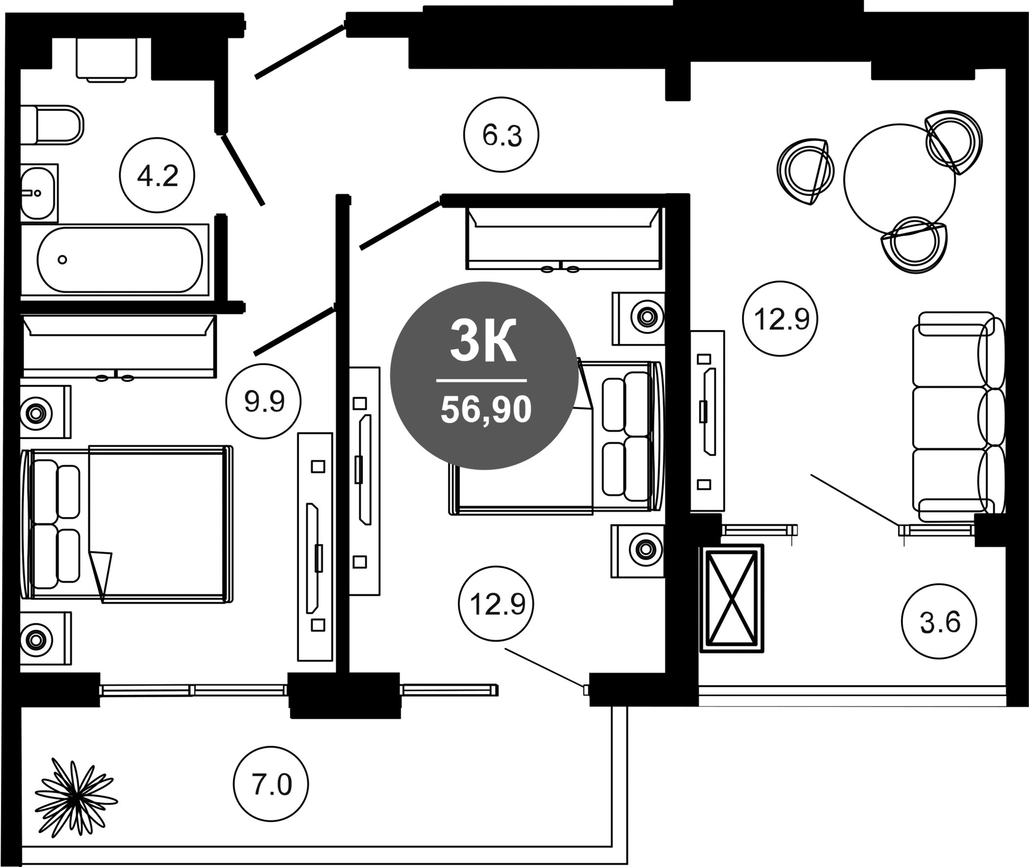 Общая площадь: 56.90м2