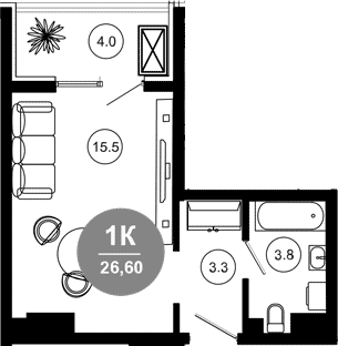 Квартира этаж 9, площадь 26.60 м2