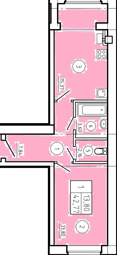 Общая площадь: 42.77м2