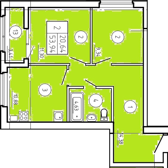 Общая площадь: 53.94м2