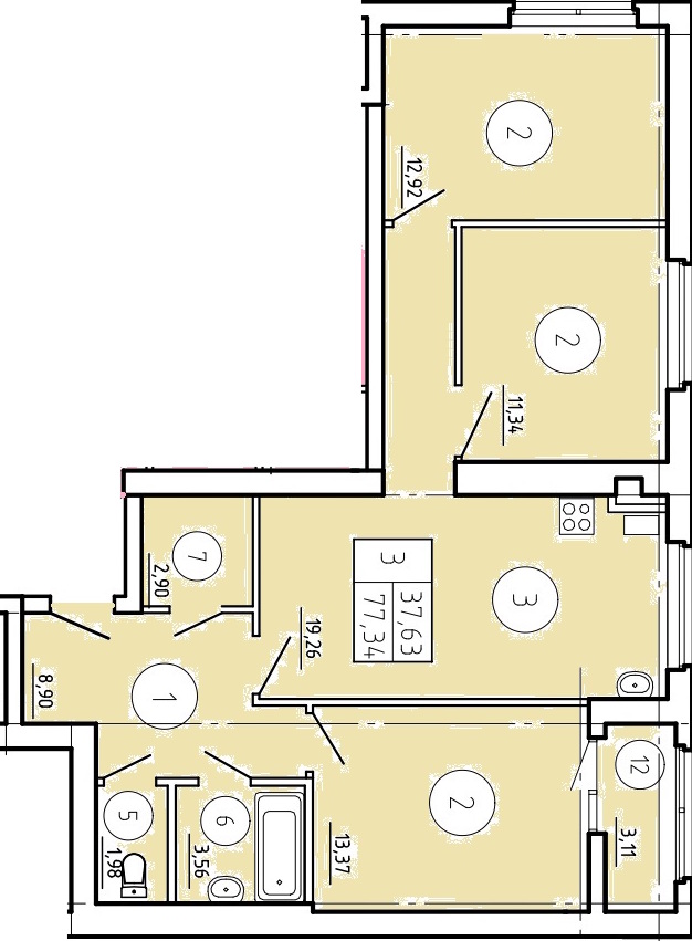 Общая площадь: 77.34м2