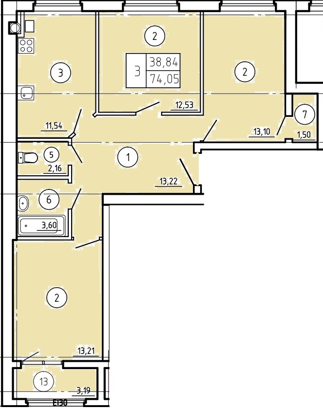 Квартира этаж 7, площадь 74.05 м2