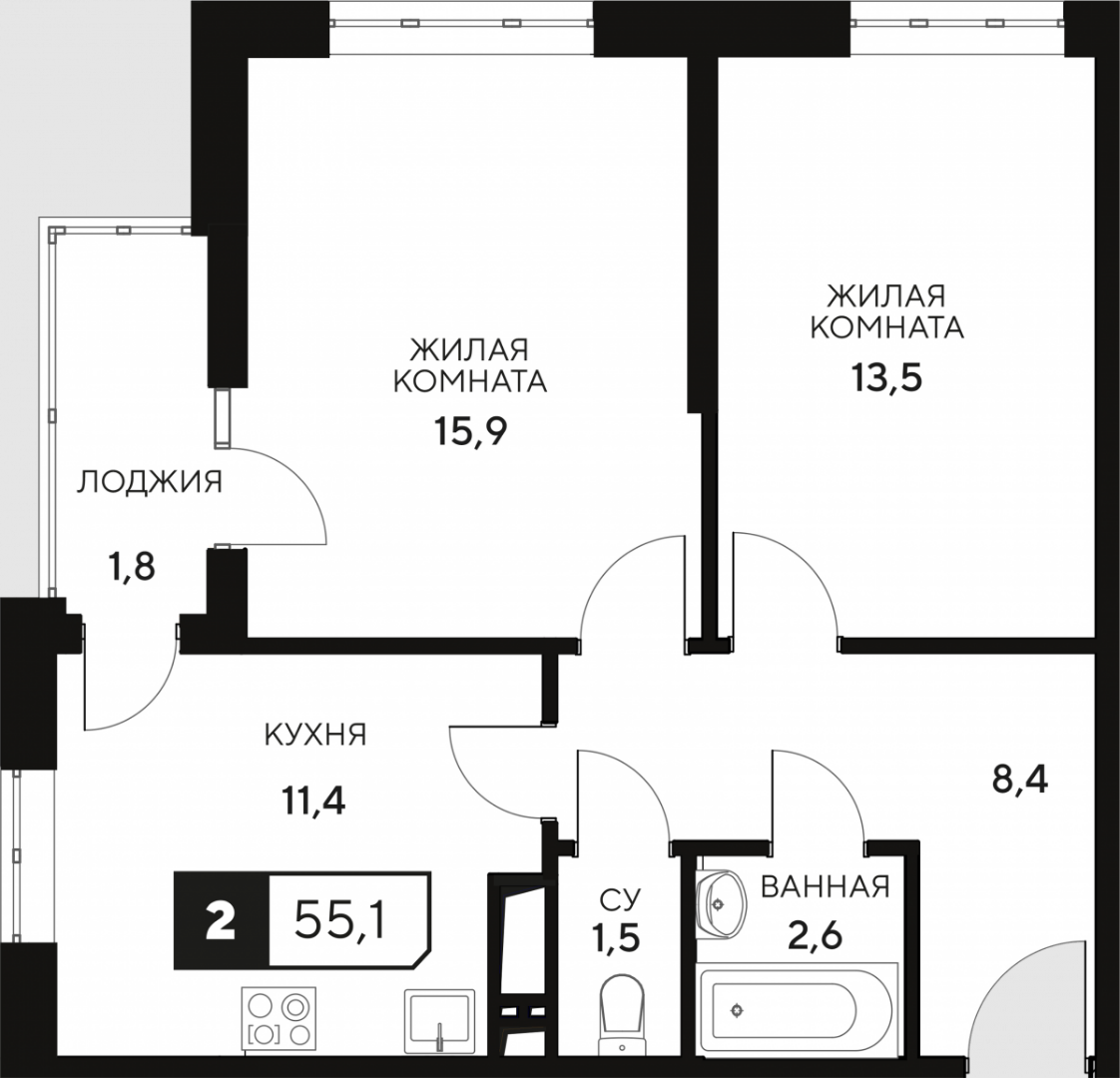Квартира этаж 14, площадь 55.40 м2
