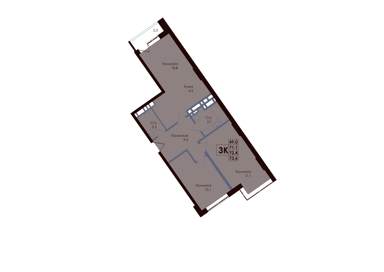 Общая площадь: 72.40м2