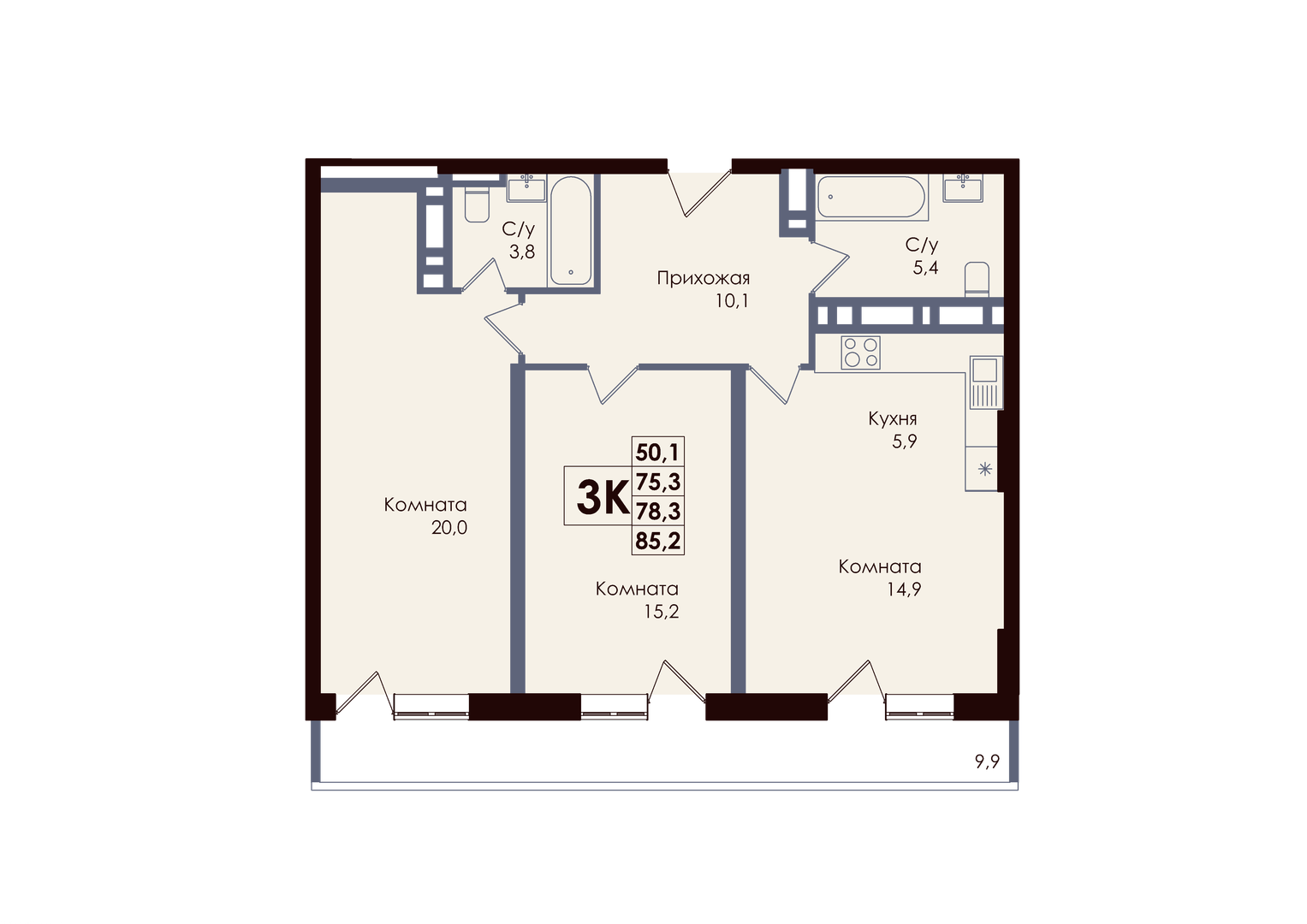 Общая площадь: 78.30м2