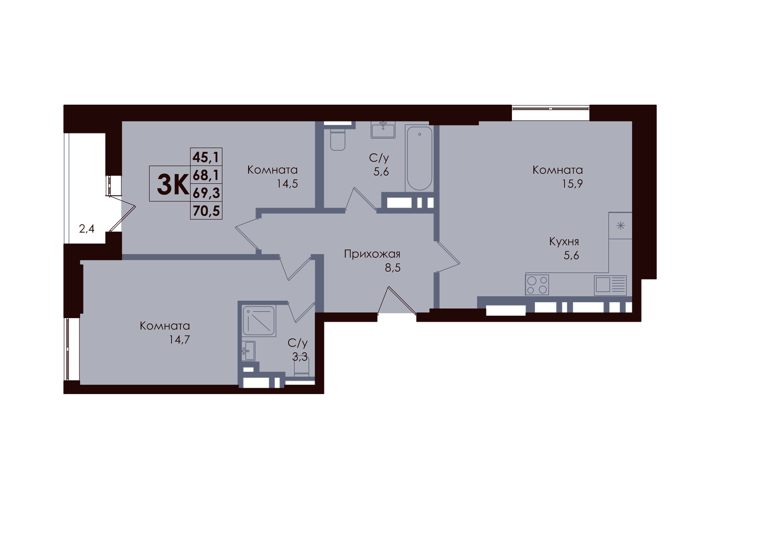 Общая площадь: 69.30м2