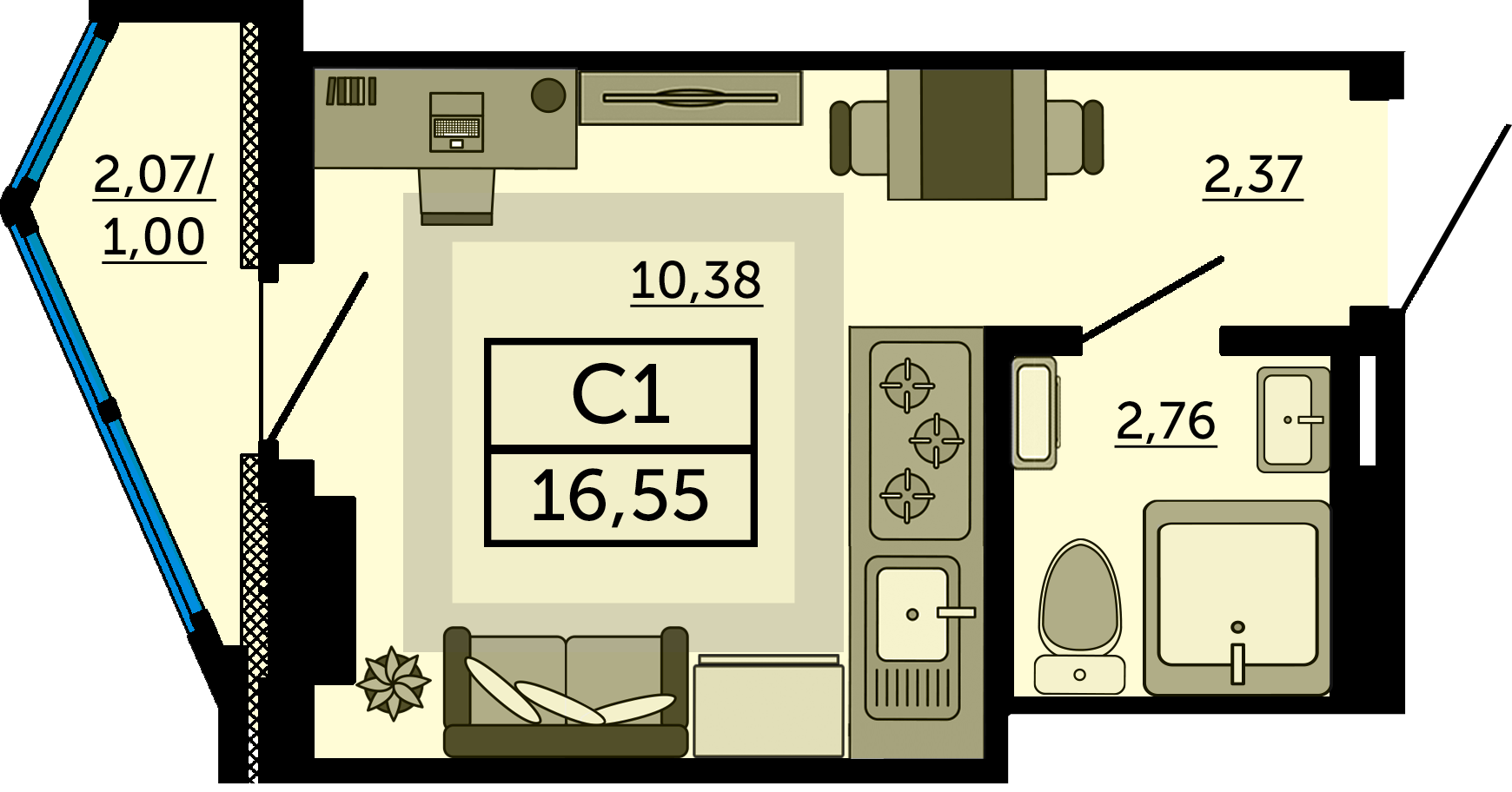Общая площадь: 16.55м2