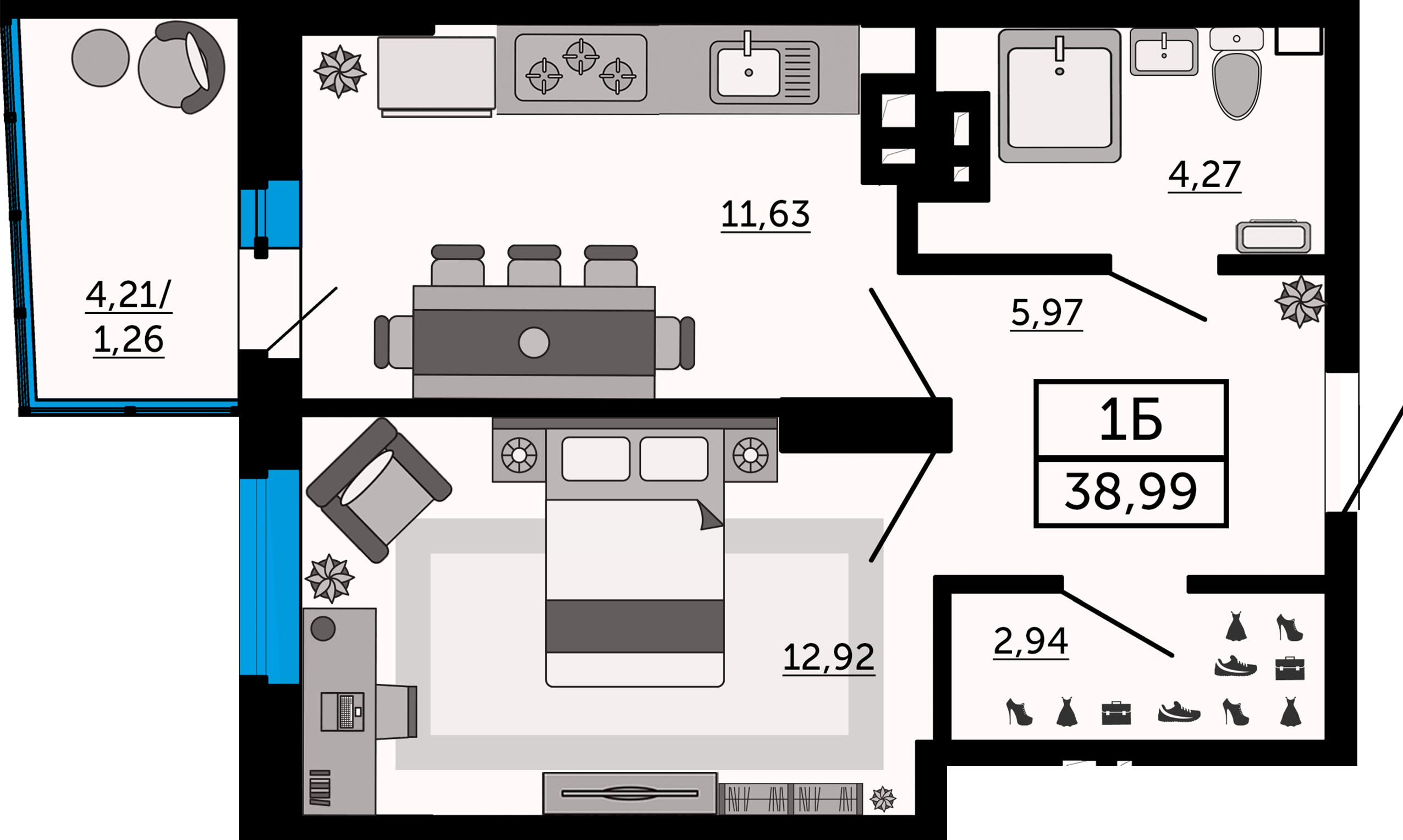 Общая площадь: 38.96м2