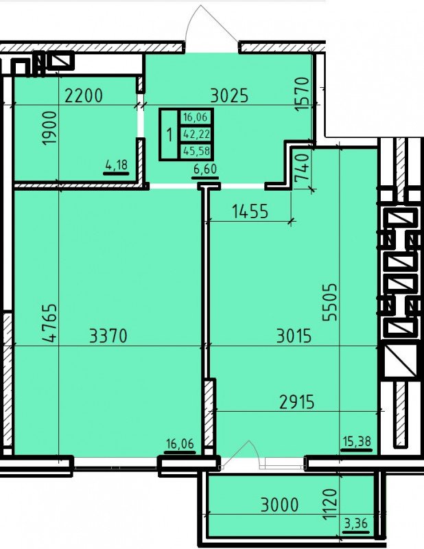 Общая площадь: 45.58м2