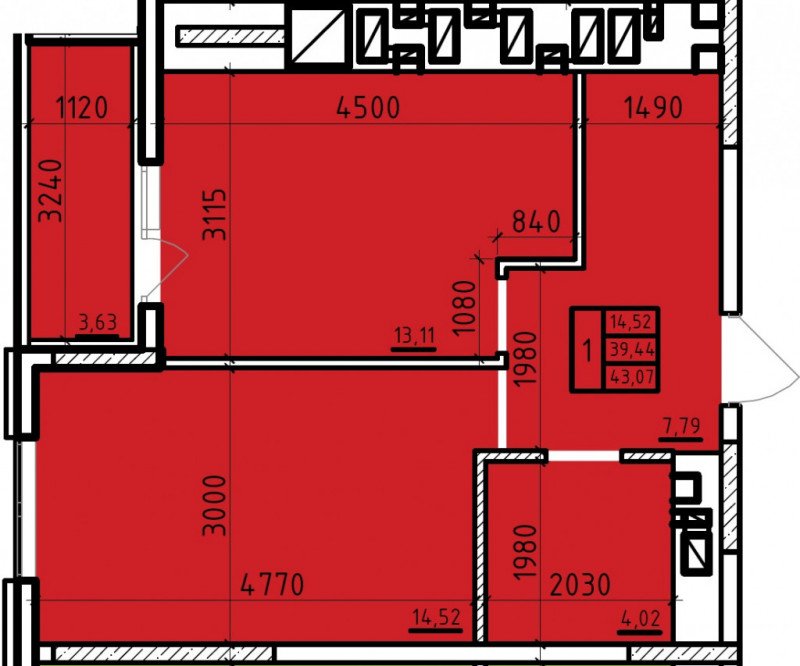Общая площадь: 43.07м2