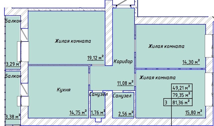 Квартира этаж 3, площадь 82.25 м2