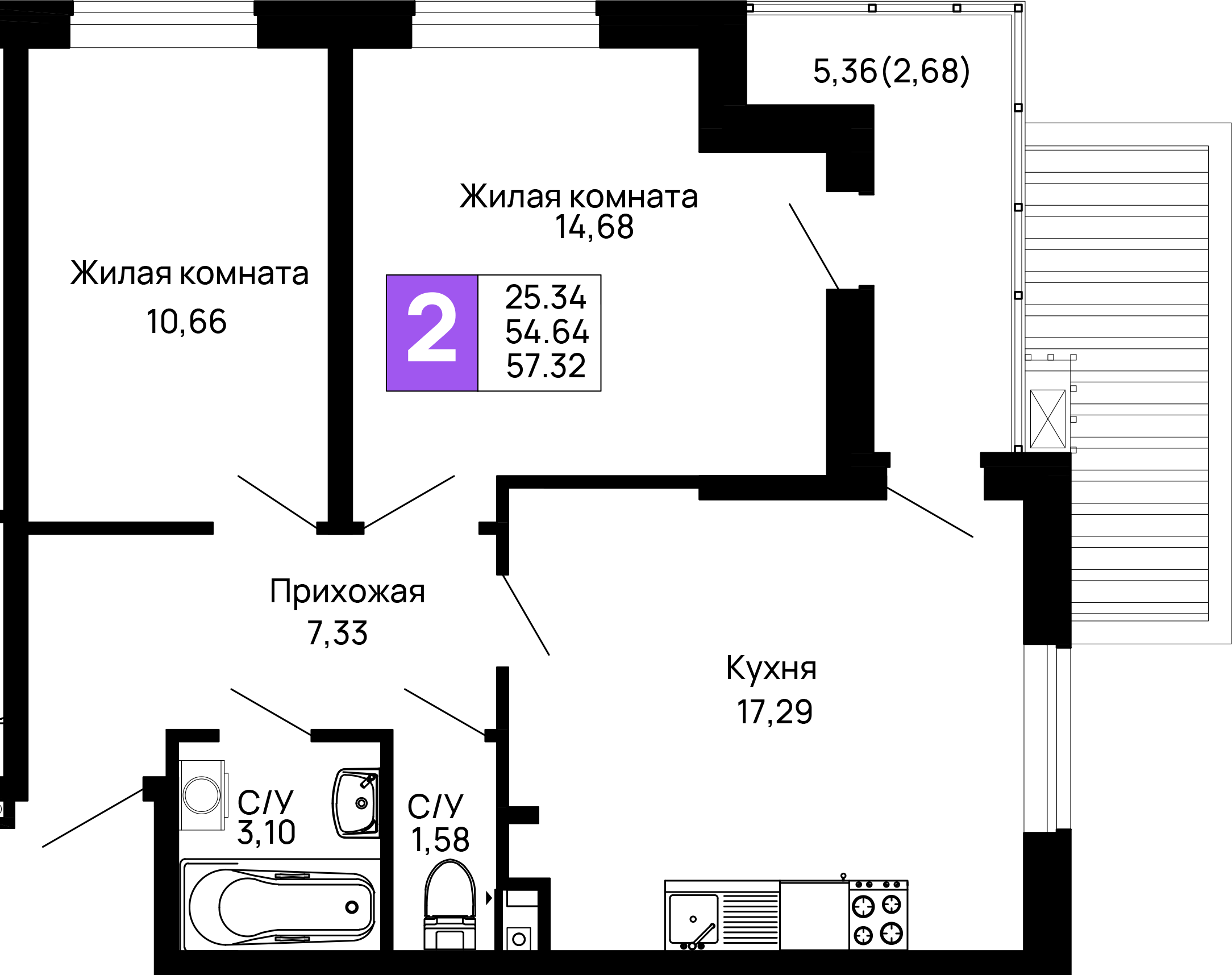 Общая площадь: 57.18м2