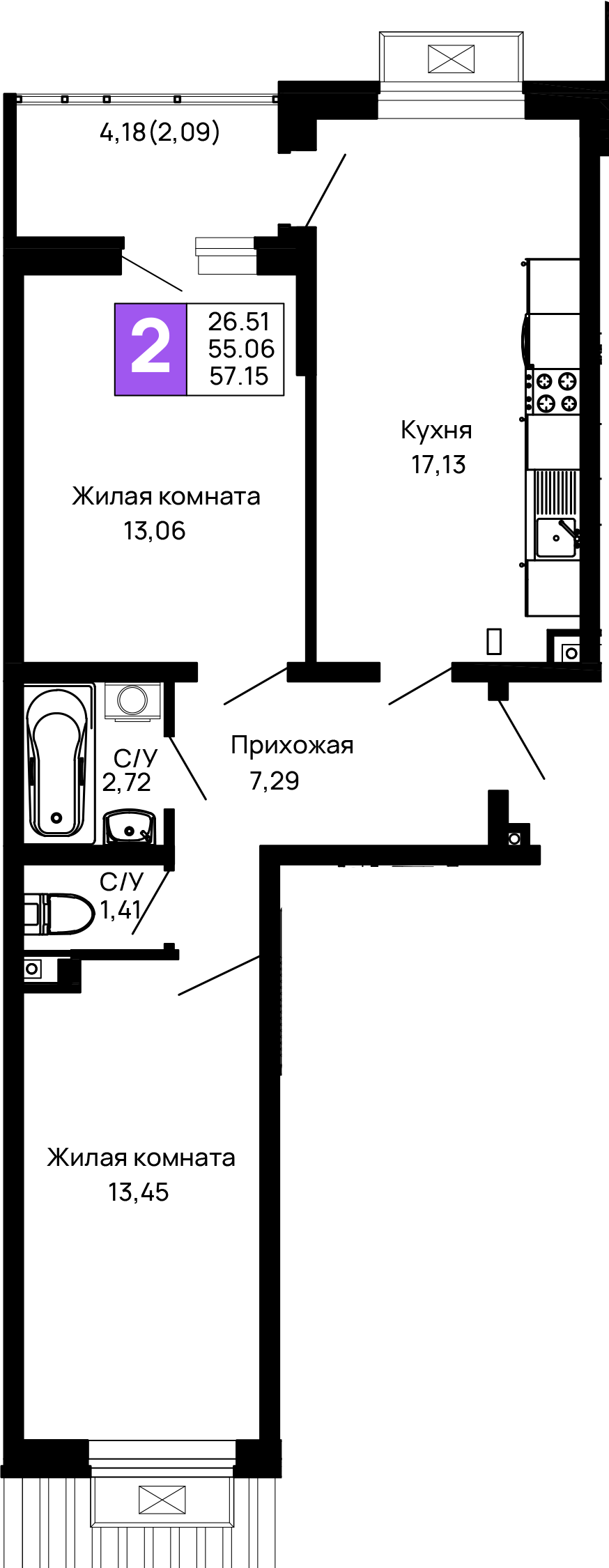 Общая площадь: 57.01м2