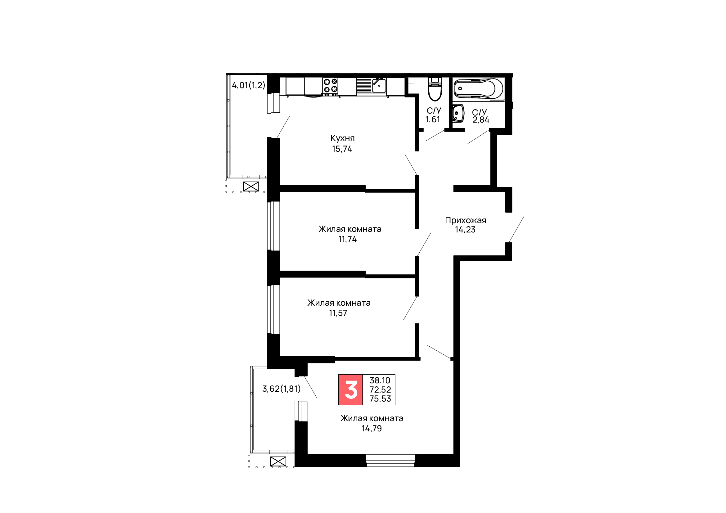 Общая площадь: 75.53м2