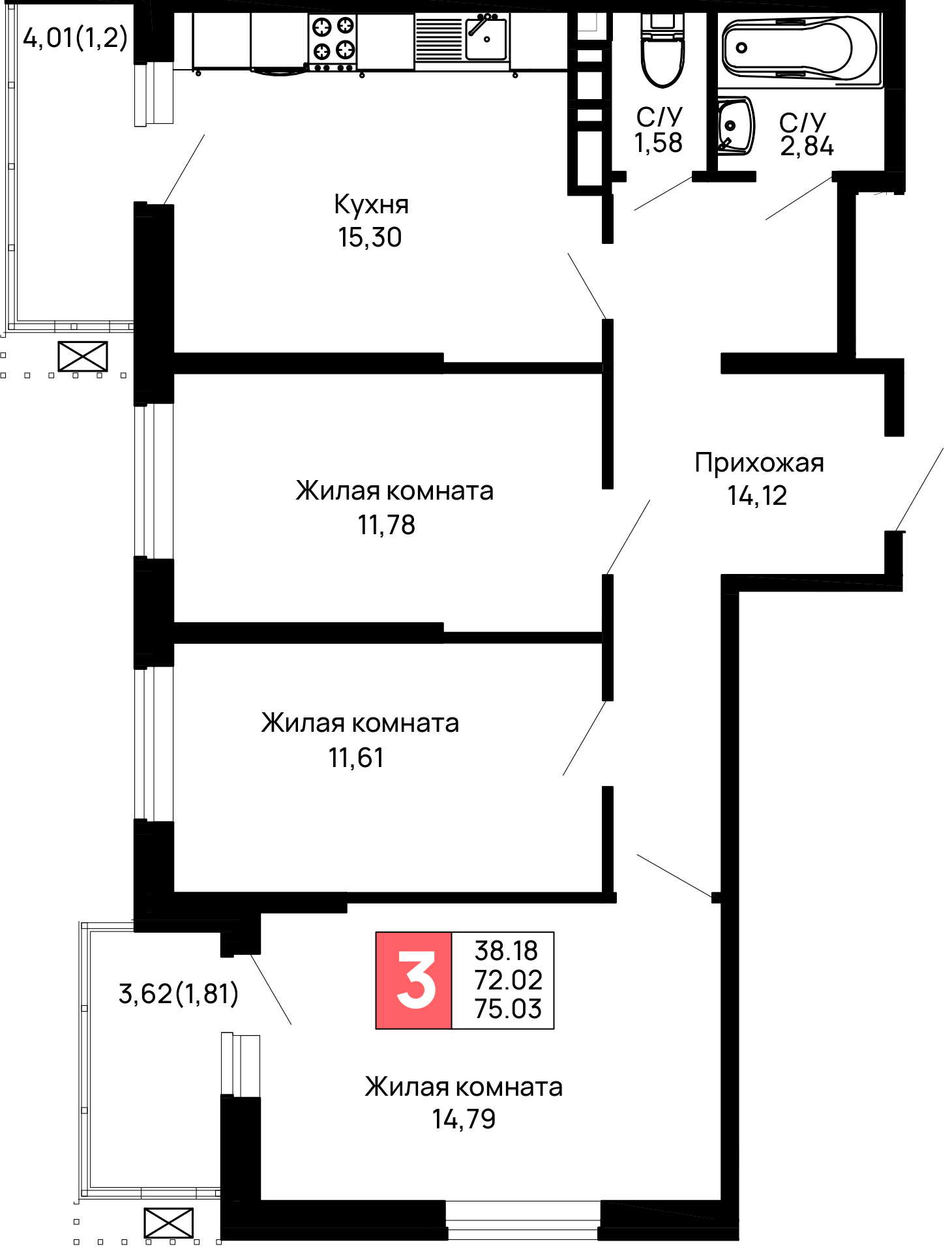 Общая площадь: 75.03м2