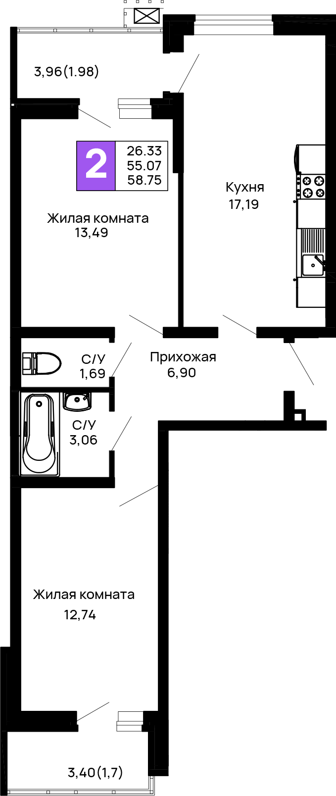 Квартира этаж 2, площадь 58.75 м2