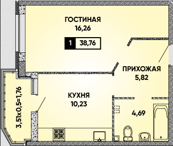 Общая площадь: 38.76м2