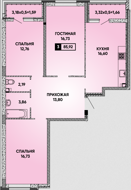 Общая площадь: 85.92м2