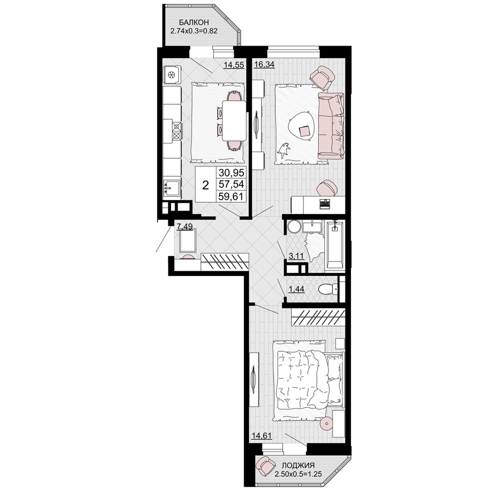Общая площадь: 59.61м2