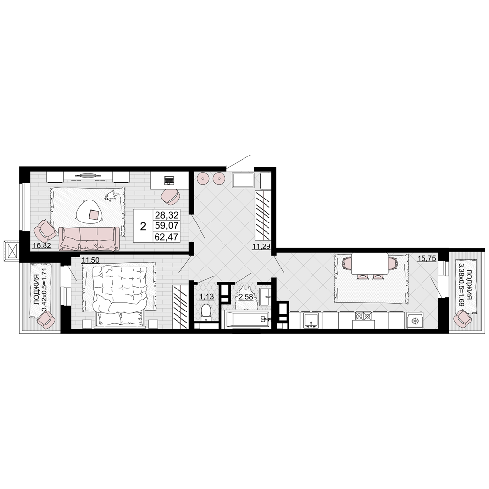 Общая площадь: 62.47м2