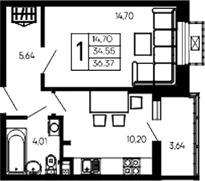 Общая площадь: 36.37м2