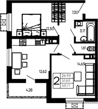 Квартира этаж 6, площадь 53.77 м2