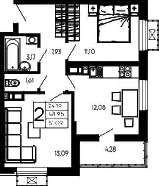 Квартира этаж 7, площадь 51.09 м2