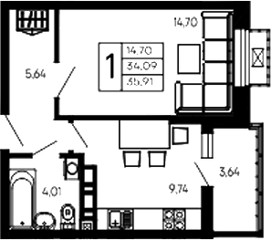 Квартира этаж 10, площадь 35.91 м2