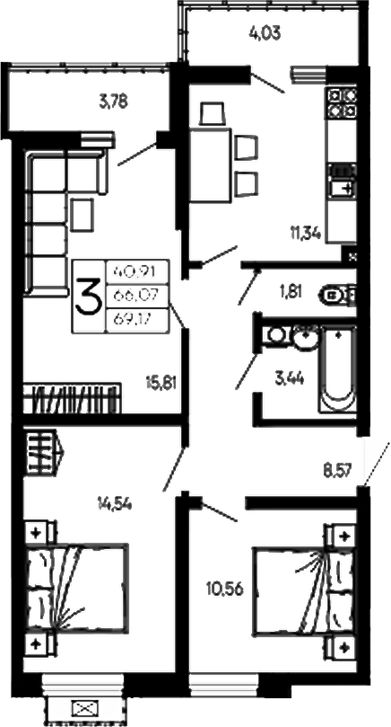Общая площадь: 69.17м2
