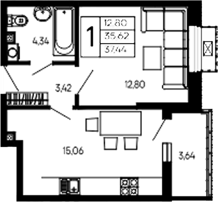 Общая площадь: 37.44м2