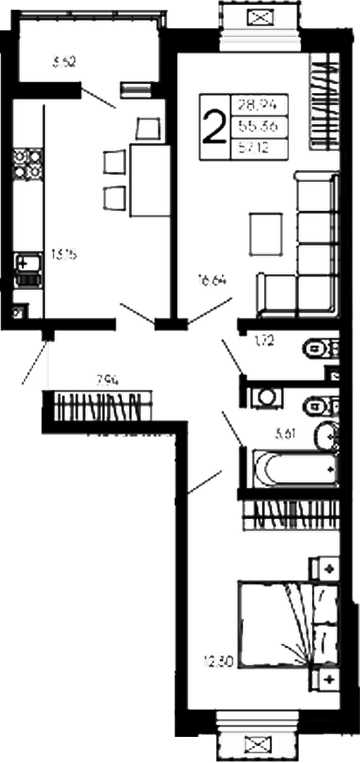 Квартира этаж 2, площадь 57.12 м2