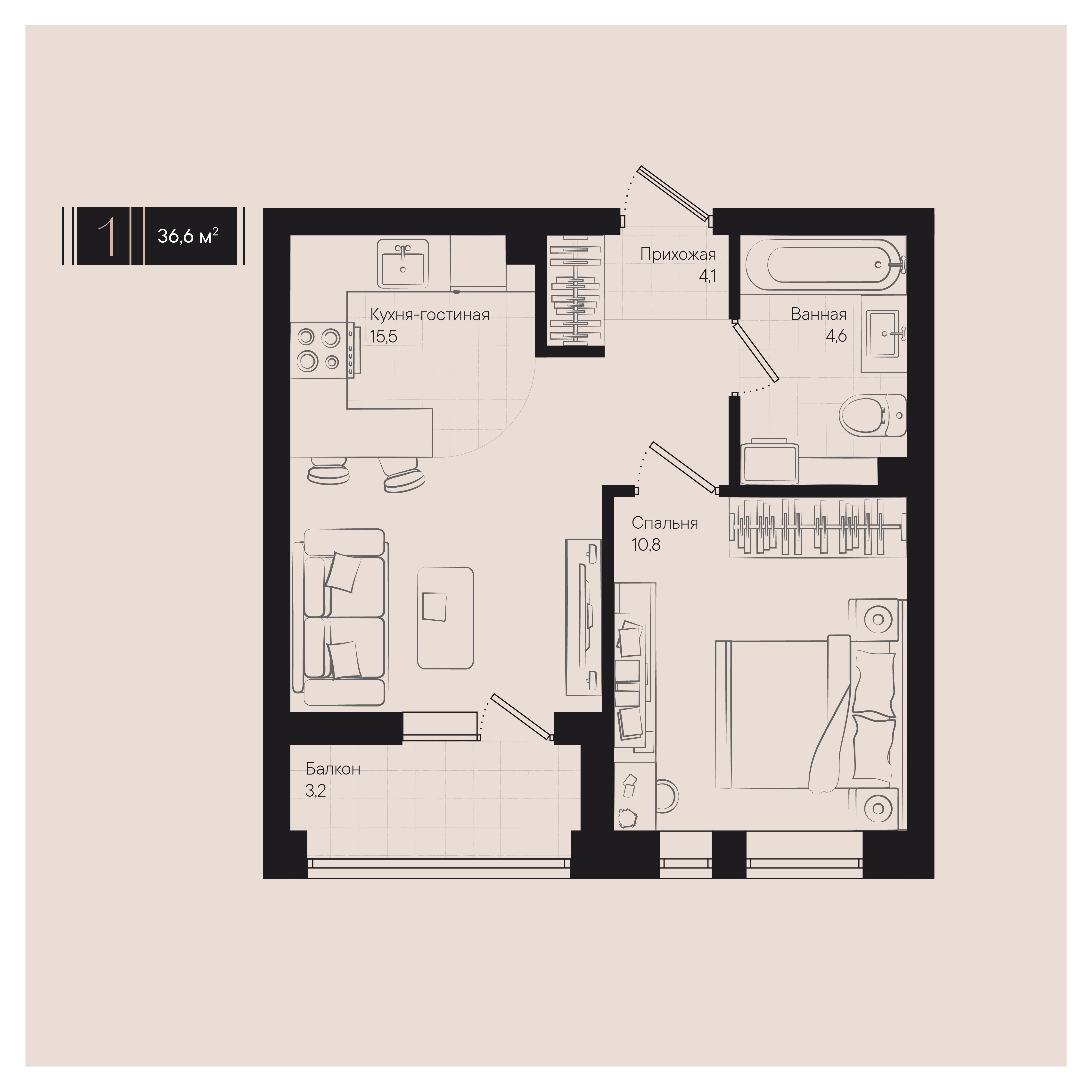 Общая площадь: 36.60м2