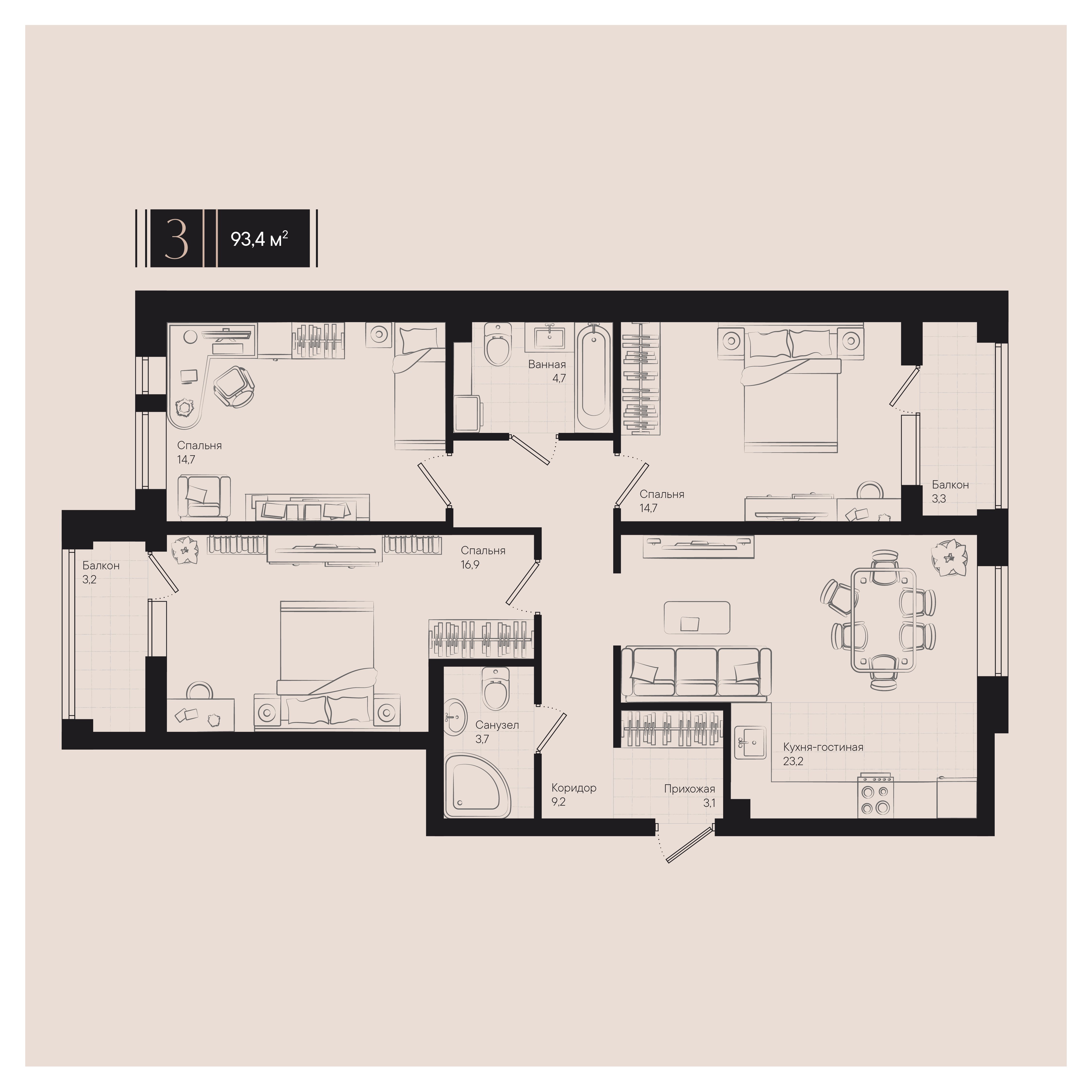 Общая площадь: 93.40м2