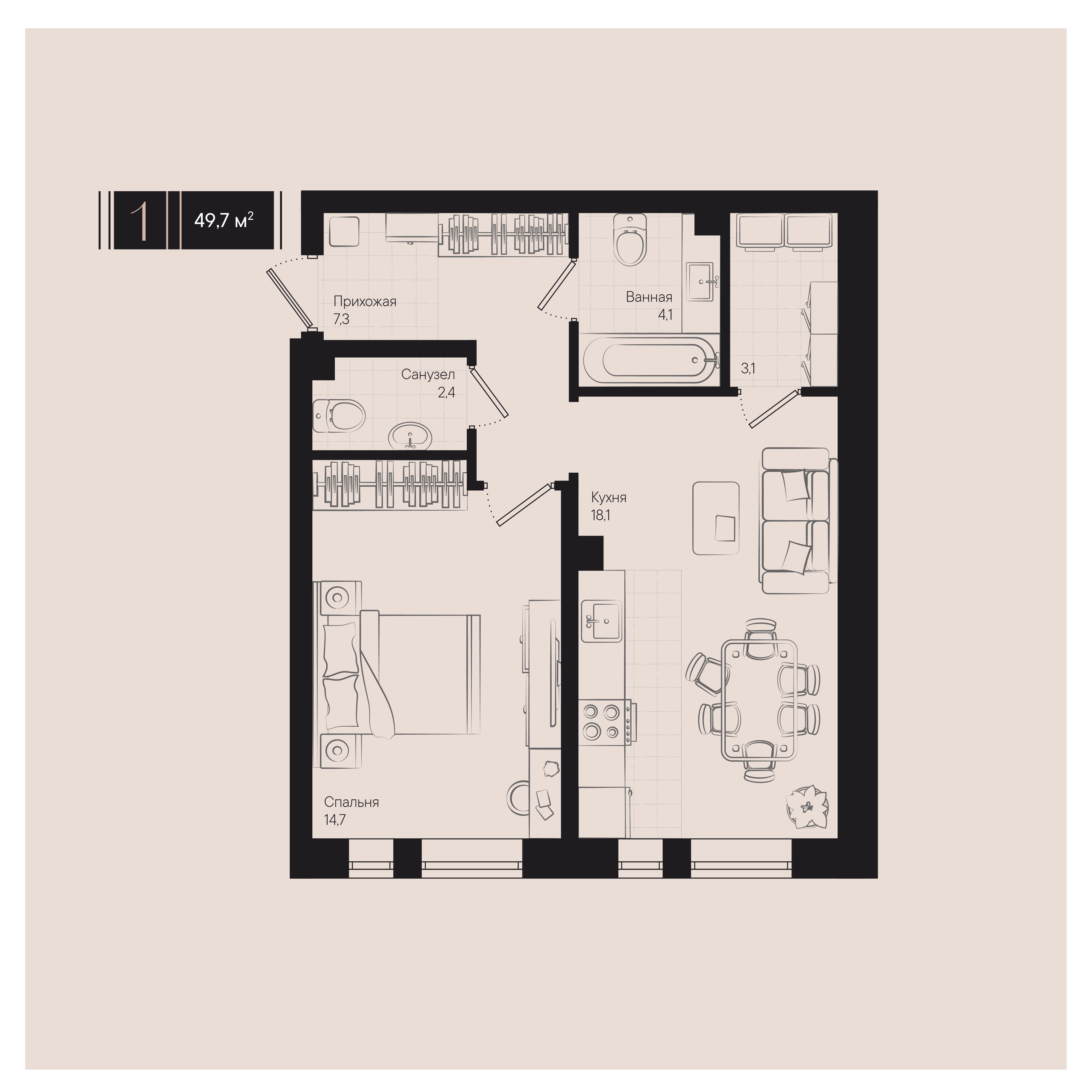 Общая площадь: 49.70м2