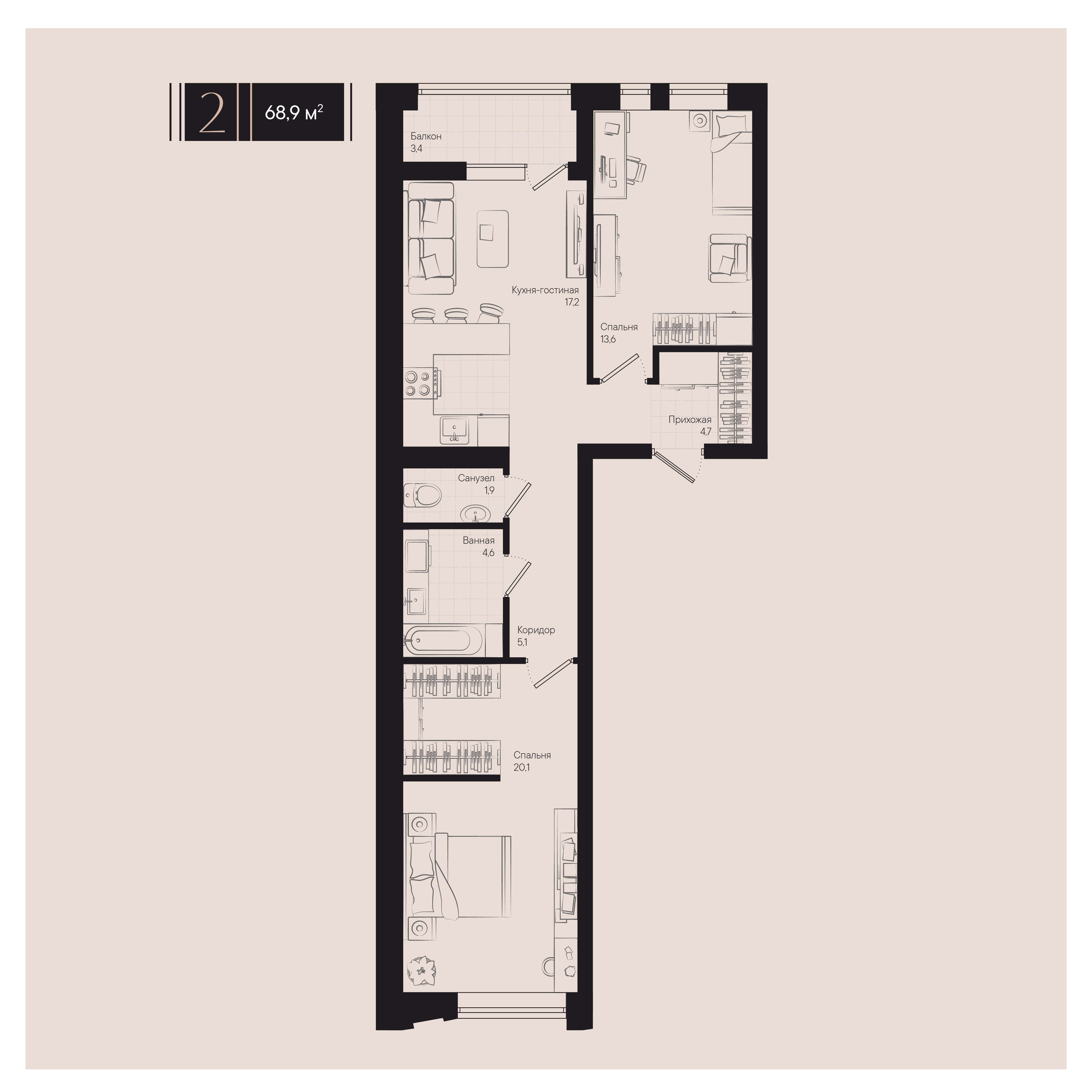 Общая площадь: 68.90м2