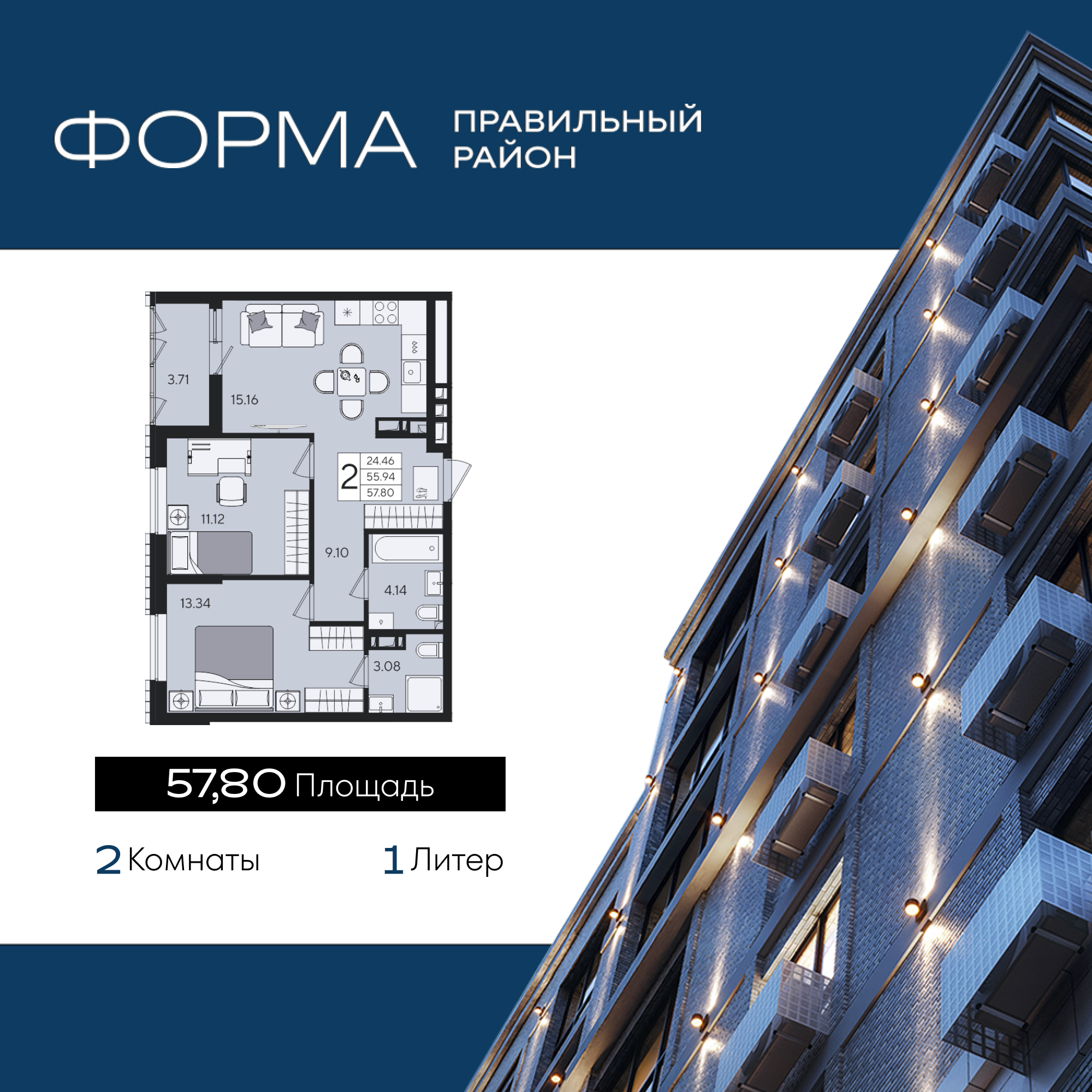 Общая площадь: 57.80м2