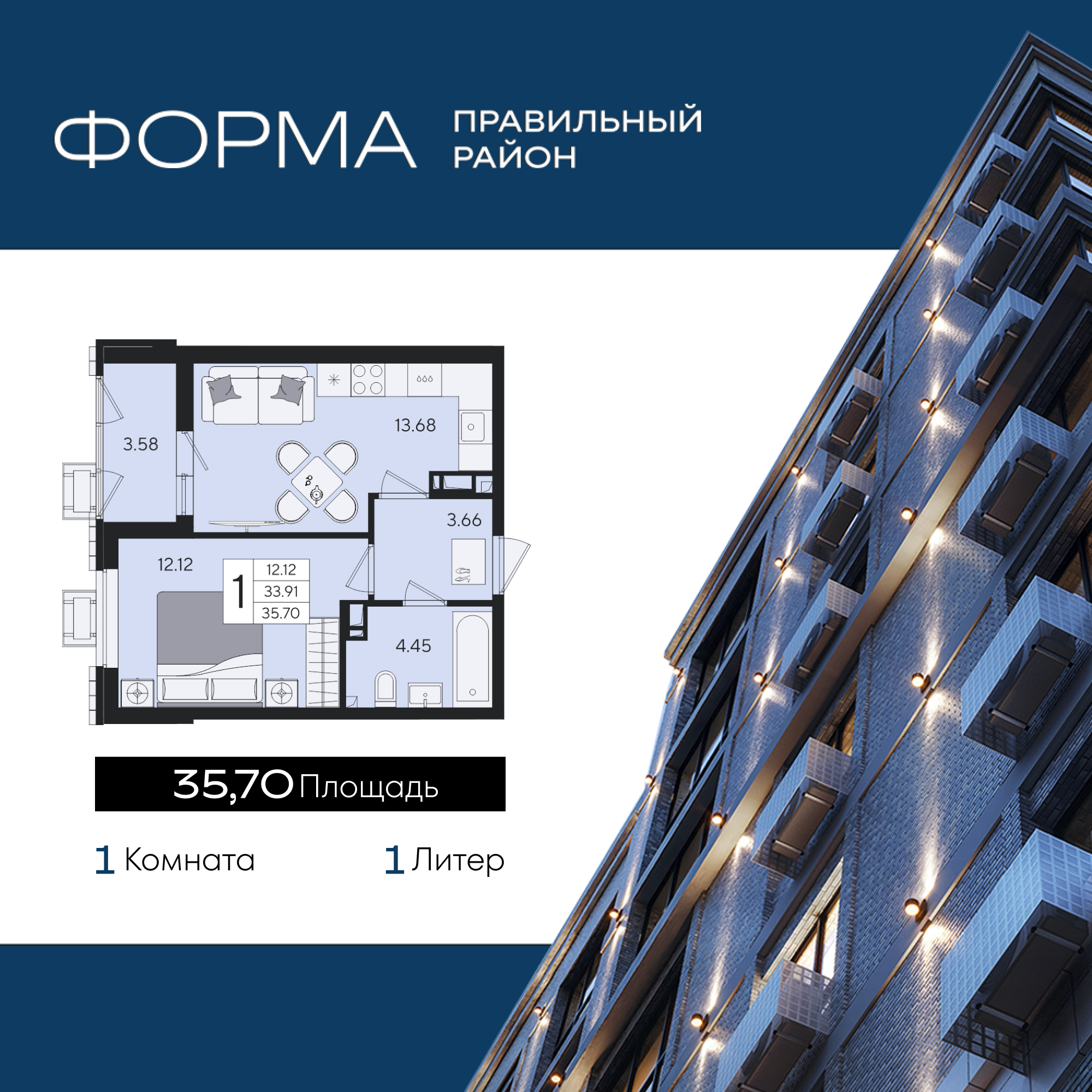 Квартира этаж 7, площадь 35.70 м2