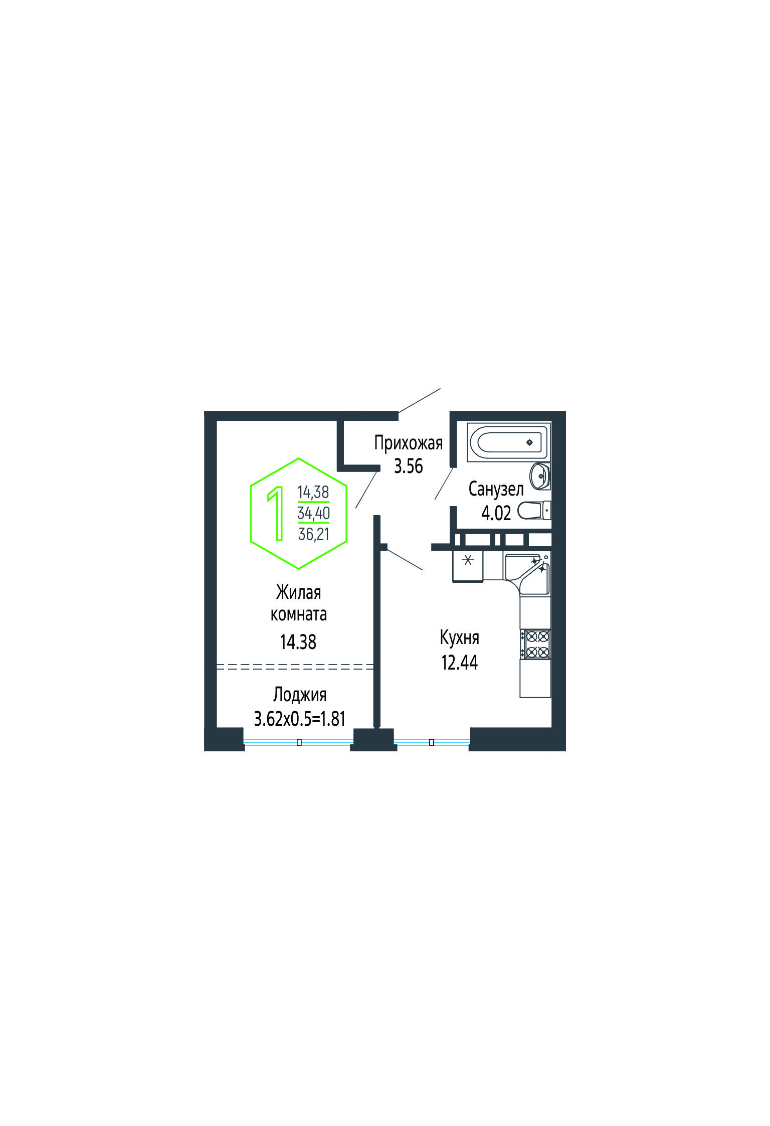 Квартира этаж 17, площадь 35.79 м2
