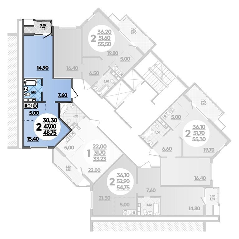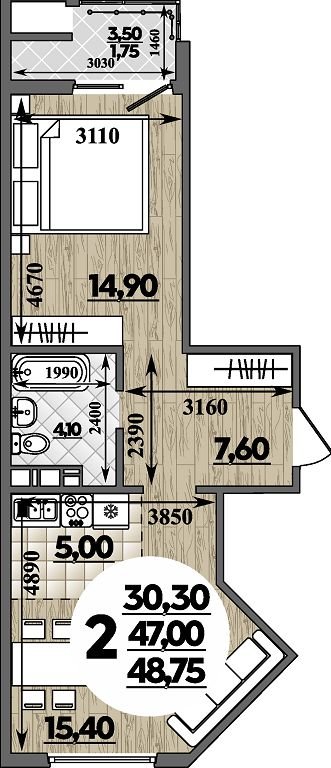 Общая площадь: 48.75м2