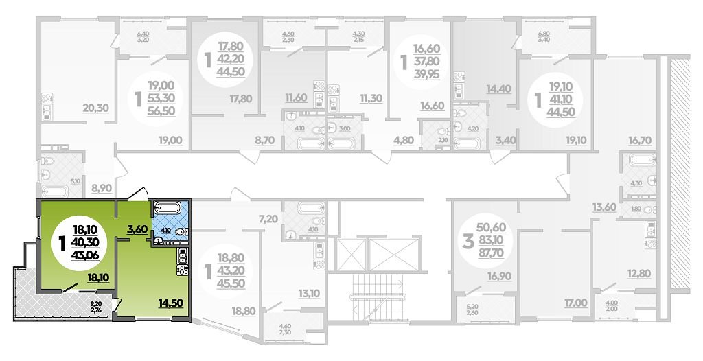 Квартира этаж 9, площадь 43.06 м2