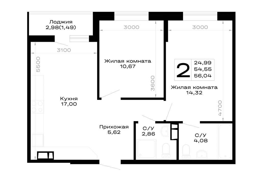 Общая площадь: 56.04м2