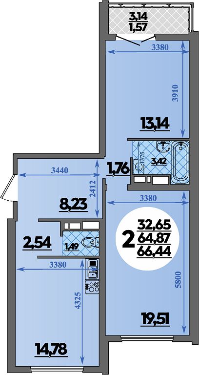 Общая площадь: 66.44м2
