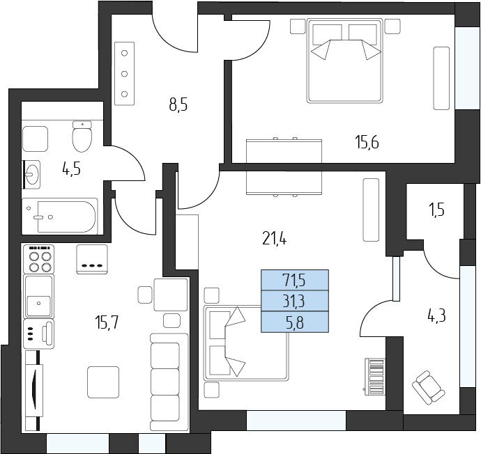 Общая площадь: 68.30м2