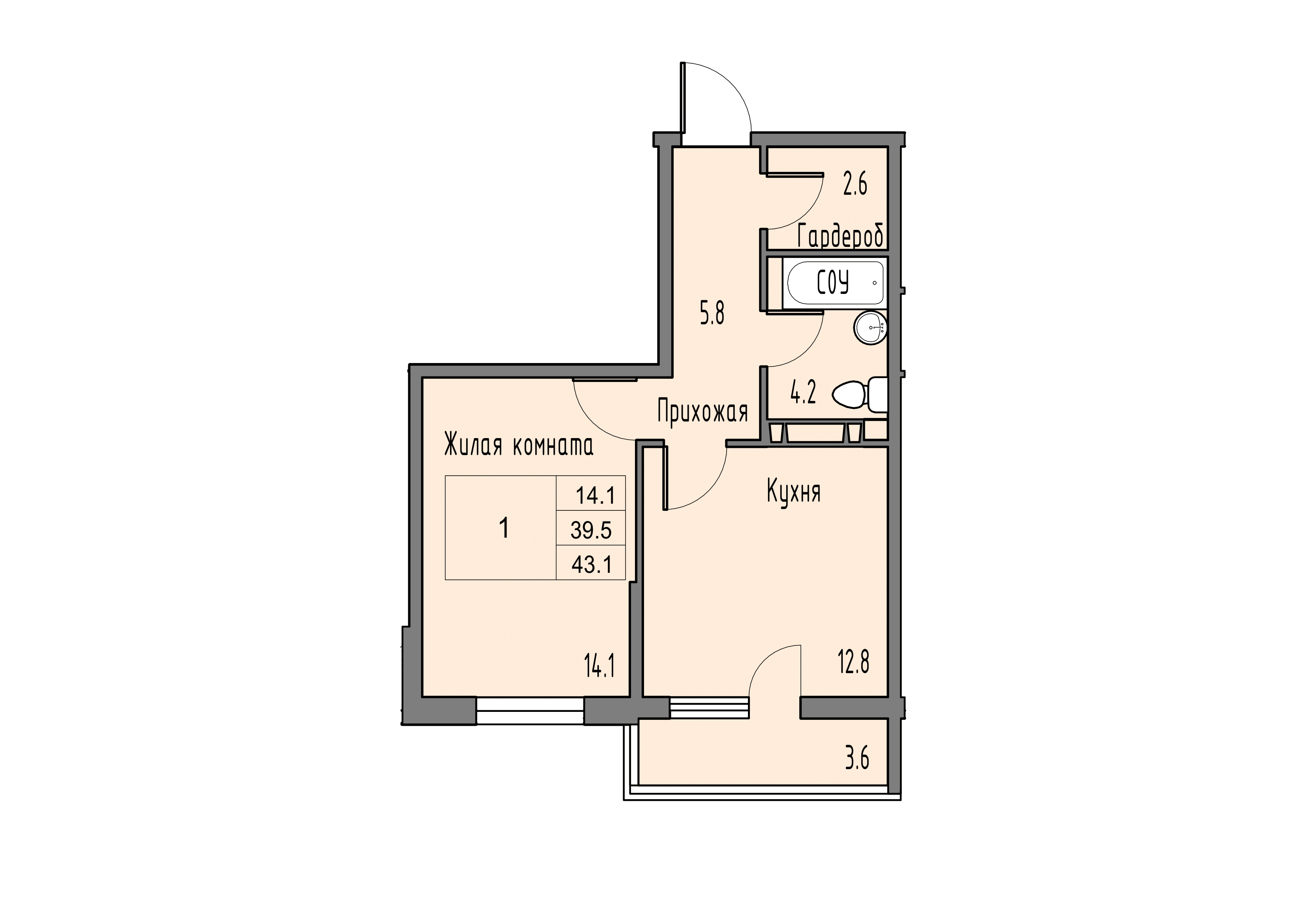 Общая площадь: 41.70м2